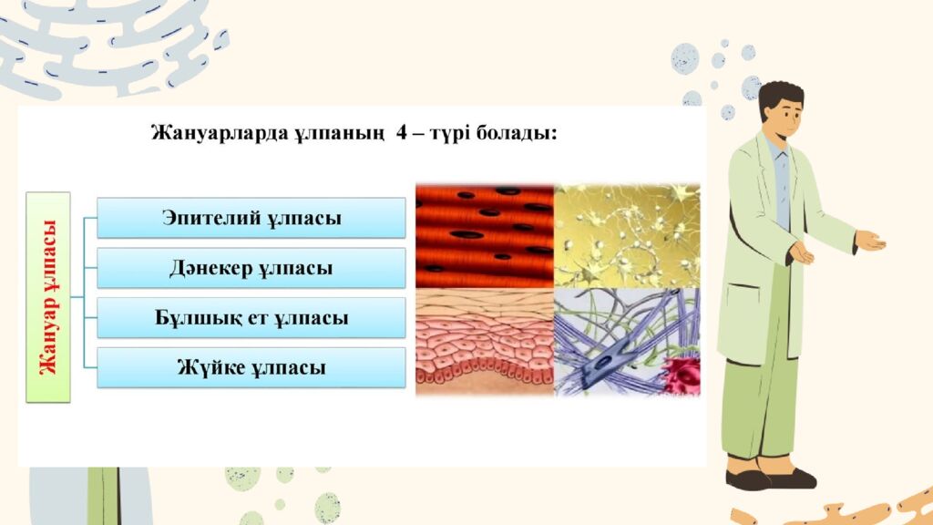Жануарлар ұлпасының түрлері Сүйек ұлпасы Жүйке ұлпасы Қан ұлпасы май ұлпасы Эпителий ұлпасы Бұлшық ет Шеміршек ұлпасы Дәнекер ұлпа
