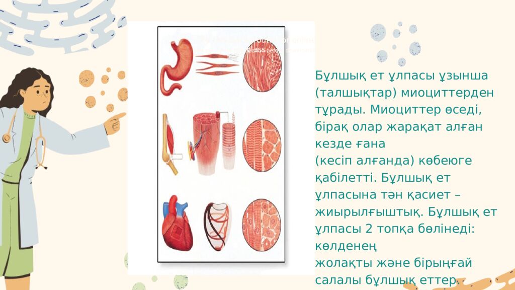 Try this background for online class. *Please delete this section before downloading. Бұлшық ет ұлпасы ұзынша (талшықтар) миоциттер ден тұрады. Миоциттер өседі, бірақ олар жарақат алған кезде ғана (кесіп алғанда) көбеюге қабілетті. Бұлшық ет ұлпасына тән қасиет – жиырылғыштық. Бұлшық ет ұлпасы 2 топқа бөлінеді: көлденең жолақты және бірыңғай салалы бұлшық еттер.