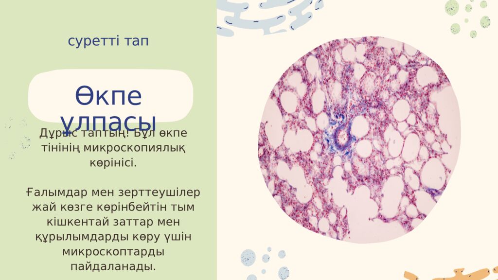 Дұрыс таптың! Бұл өкпе тінінің микроскопиялық көрінісі. Ғалымдар мен зерттеушілер жай көзге көрінбейтін тым кішкентай заттар мен құрылымдарды көру үшін микроскоптарды пайдаланады. Өкпе ұлпасы суретті тап