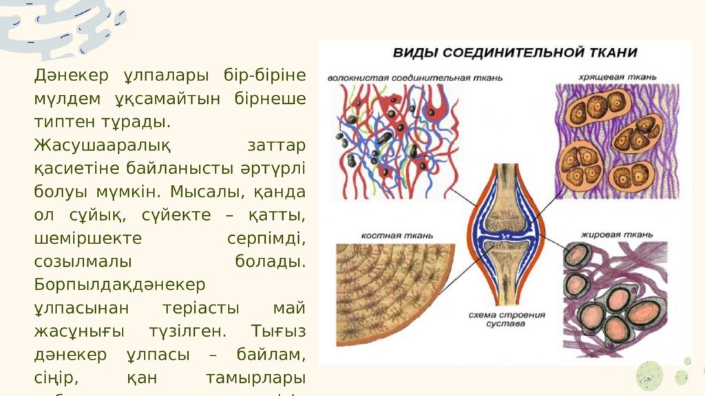 Дәнекер ұлпалары бір-біріне мүлдем ұқсамайтын бірнеше типтен тұрады. Жасушааралық заттар қасиетіне байланысты әртүрлі болуы мүмкін. Мысалы, қанда ол сұйық, сүйекте – қатты, шеміршекте серпімді, созылмалы болады. Борпылдақдәнекер ұлпасынан теріасты май жасұнығы түзілген. Тығыз дәнекер ұлпасы – байлам, сіңір, қан тамырлары қабырғасының негізін құрайды.