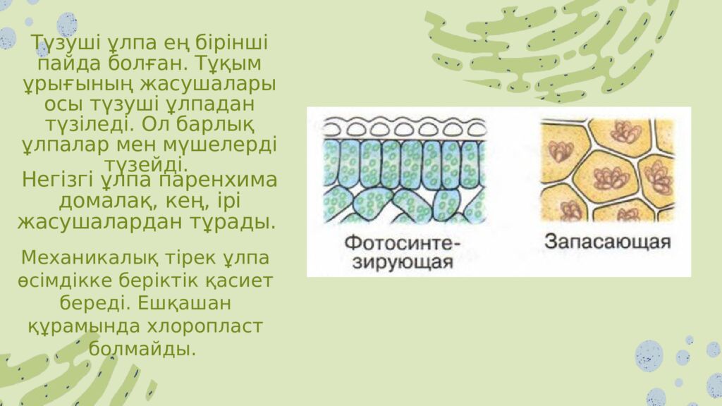 Түзуші ұлпа ең бірінші пайда болған. Тұқым ұрығының жасушалары осы түзуші ұлпадан түзіледі. Ол барлық ұлпалар мен мүшелерді түзейді. Негізгі ұлпа паренхима домалақ, кең, ірі жасушалардан тұрады. Механикалық тірек ұлпа өсімдікке беріктік қасиет береді. Ешқашан құрамында хлоропласт болмайды.
