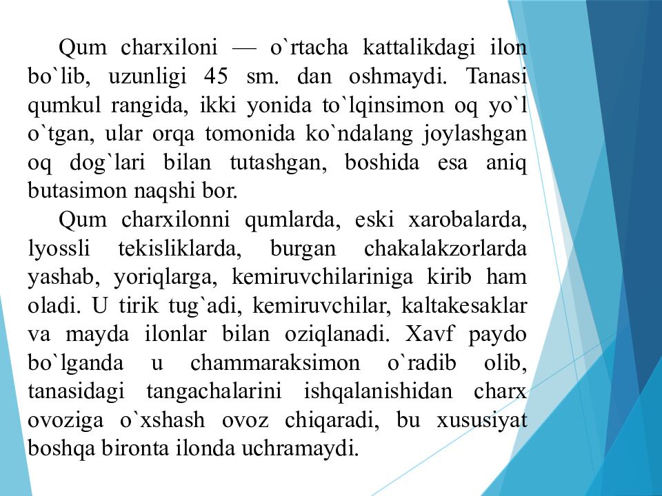Qum charxiloni — o`rtacha kattalikdagi ilon bo`lib, uzunligi 45 sm. dan oshmaydi. Tanasi qumkul rangida, ikki yonida to`lqinsimon oq yo`l o`tgan, ular orqa tomonida ko`ndalang joylashgan oq dog`lari bilan tutashgan, boshida esa aniq butasimon naqshi bor. Qum charxilonni qumlarda, eski xarobalarda, lyossli tekisliklarda, burgan chakalakzorlarda yashab, yoriqlarga, kemiruvchilariniga kirib ham oladi. U tirik tug`adi, kemiruvchilar, kaltakesaklar va mayda ilonlar bilan oziqlanadi. Xavf paydo bo`lganda u chammaraksimon o`radib olib, tanasidagi tangachalarini ishqalanishidan charx ovoziga o`xshash ovoz chiqaradi, bu xususiyat boshqa bironta ilonda uchramaydi.