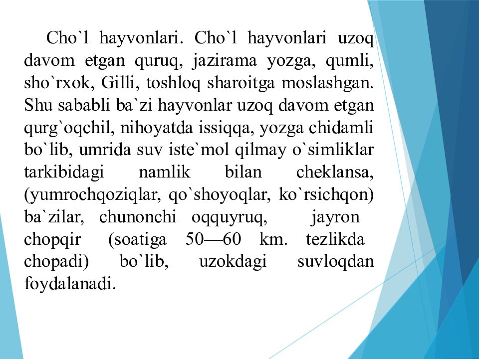 Cho`l hayvonlari. Cho`l hayvonlari uzoq davom etgan quruq, jazirama yozga, qumli, sho`rxok, Gilli, toshloq sharoitga moslashgan. Shu sababli ba`zi hayvonlar uzoq davom etgan qurg`oqchil, nihoyatda issiqqa, yozga chidamli bo`lib, umrida suv iste`mol qilmay o`simliklar tarkibidagi namlik bilan cheklansa, ( yumrochqoziqlar, qo`shoyoqlar, ko`rsichqon ) ba`zilar, chunonchi oqquyruq, jayron chopqir ( soatiga 50—60 km. tezlikda chopadi ) bo`lib, uzokdagi suvloqdan foydalanadi.