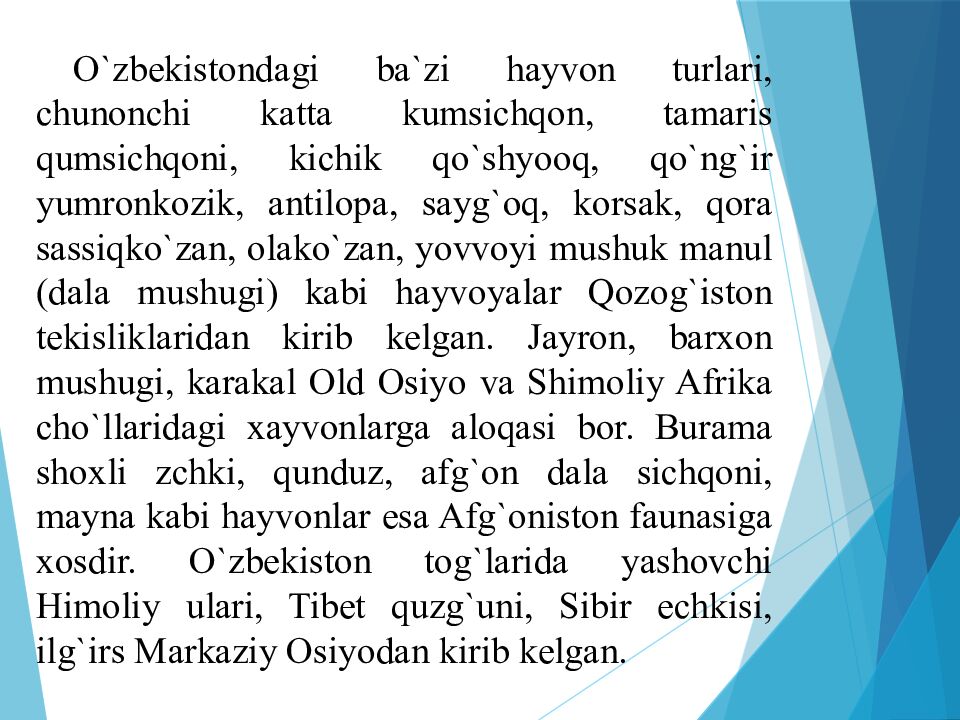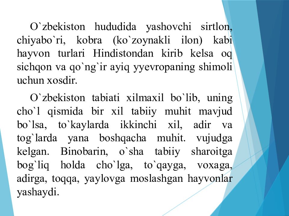 O`zbekiston hududida yashovchi sirtlon, chiyabo`ri, kobra ( ko`zoynakli ilon ) kabi hayvon turlari Hindistondan kirib kelsa oq sichqon va qo`ng`ir ayiq yyevropaning shimoli uchun xosdir. O`zbekiston tabiati xilmaxil bo`lib, uning cho`l qismida bir xil tabiiy muhit mavjud bo`lsa, to`kaylarda ikkinchi xil, adir va tog`larda yana boshqacha muhit. vujudga kelgan. Binobarin, o`sha tabiiy sharoitga bog`liq holda cho`lga, to`qayga, voxaga, adirga, toqqa, yaylovga moslashgan hayvonlar yashaydi.