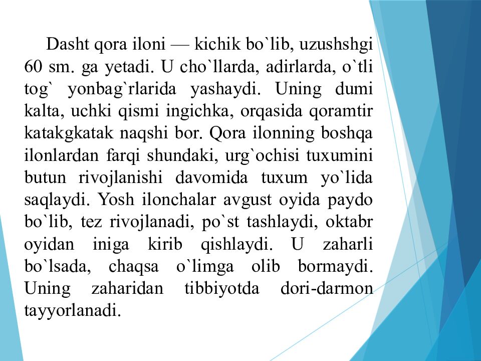 Dasht qora iloni — kichik bo`lib, uzushshgi 60 sm. ga yetadi. U cho`llarda, adirlarda, o`tli tog` yonbag`rlarida yashaydi. Uning dumi kalta, uchki qismi ingichka, orqasida qoramtir katakgkatak naqshi bor. Qora ilonning boshqa ilonlardan farqi shundaki, urg`ochisi tuxumini butun rivojlanishi davomida tuxum yo`lida saqlaydi. Yosh ilonchalar avgust oyida paydo bo`lib, tez rivojlanadi, po`st tashlaydi, oktabr oyidan iniga kirib qishlaydi. U zaharli bo`lsada, chaqsa o`limga olib bormaydi. Uning zaharidan tibbiyotda dori-darmon tayyorlanadi.