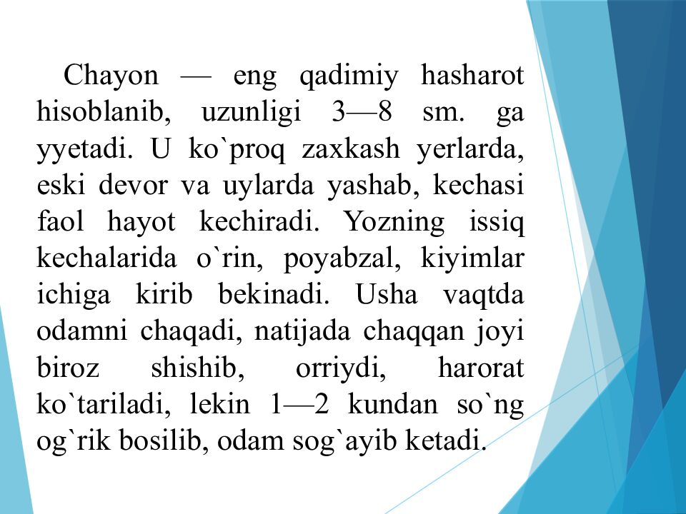 Chayon — eng qadimiy hasharot hisoblanib, uzunligi 3—8 sm. ga yyetadi. U ko`proq zaxkash yerlarda, eski devor va uylarda yashab, kechasi faol hayot kechiradi. Yozning issiq kechalarida o`rin, poyabzal, kiyimlar ichiga kirib bekinadi. Usha vaqtda odamni chaqadi, natijada chaqqan joyi biroz shishib, orriydi, harorat ko`tariladi, lekin 1—2 kundan so`ng og`rik bosilib, odam sog`ayib ketadi.