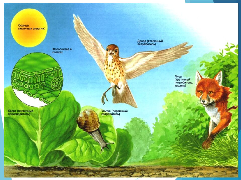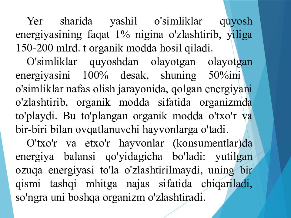Yer sharida yashil o'simliklar quyosh energiyasining faqat 1% nigina o'zlashtirib, yiliga 150-200 mlrd. t organik modda hosil qiladi. O'simliklar quyoshdan olayotgan olayotgan energiyasini 100% desak, shuning 50%ini o'simliklar nafas olish jarayonida, qolgan energiyani o'zlashtirib, organik modda sifatida organizmda to'playdi. Bu to'plangan organik modda o'txo'r va bir-biri bilan ovqatlanuvchi hayvonlarga o'tadi. O'txo'r va etxo'r hayvonlar ( konsumentlar )da energiya balansi qo'yidagicha bo'ladi : yutilgan ozuqa energiyasi to'la o'zlashtirilmaydi, uning bir qismi tashqi mhitga najas sifatida chiqariladi, so'ngra uni boshqa organizm o'zlashtiradi.