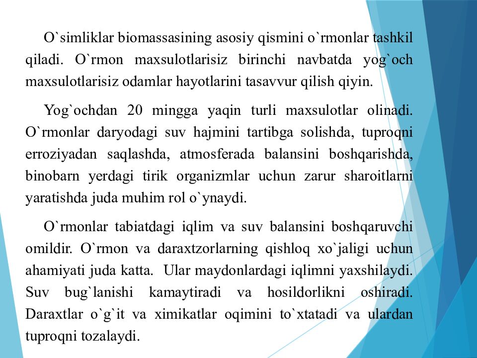 O`simliklar biomassasining asosiy qismini o`rmonlar tashkil qiladi. O`rmon maxsulotlarisiz birinchi navbatda yog`och maxsulotlarisiz odamlar hayotlarini tasavvur qilish qiyin. Yog`ochdan 20 mingga yaqin turli maxsulotlar olinadi. O`rmonlar daryodagi suv hajmini tartibga solishda, tuproqni erroziyadan saqlashda, atmosferada balansini boshqarishda, binobarn yerdagi tirik organizmlar uchun zarur sharoitlarni yaratishda juda muhim rol o`ynaydi. O`rmonlar tabiatdagi iqlim va suv balansini boshqaruvchi omildir. O`rmon va daraxtzorlarning qishloq xo`jaligi uchun ahamiyati juda katta. Ular maydonlardagi iqlimni yaxshilaydi. Suv bug`lanishi kamaytiradi va hosildorlikni oshiradi. Daraxtlar o`g`it va ximikatlar oqimini to`xtatadi va ulardan tuproqni tozalaydi.