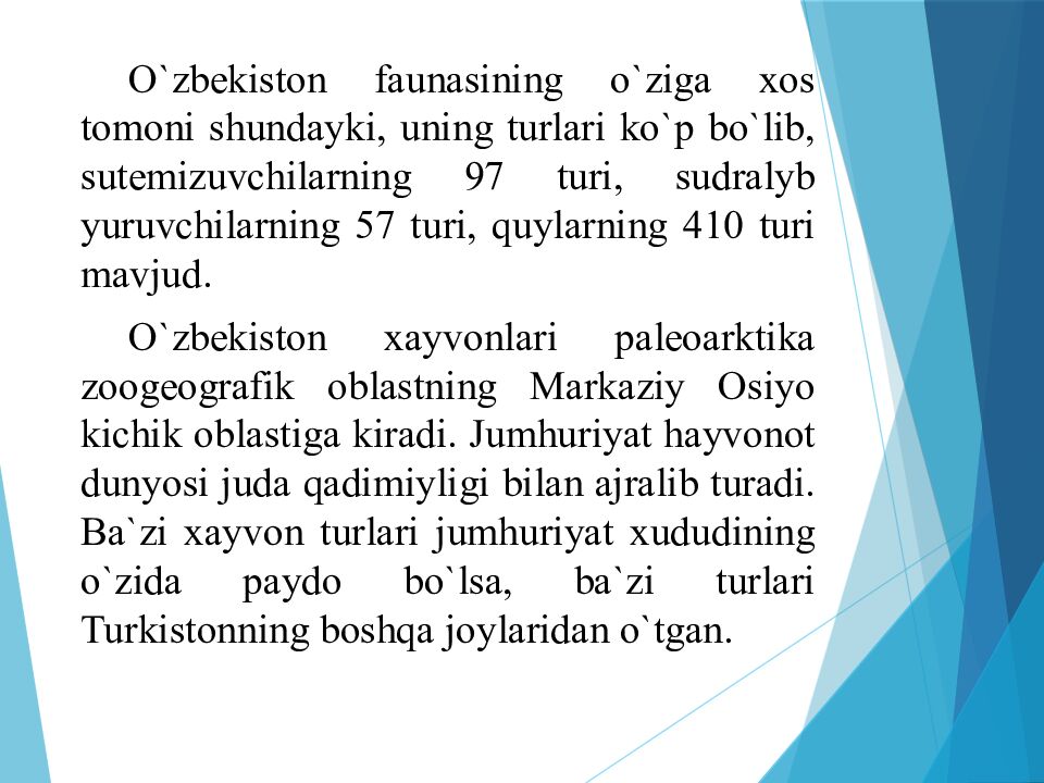 O`zbekiston faunasining o`ziga xos tomoni shundayki, uning turlari ko`p bo`lib, sutemizuvchilarning 97 turi, sudralyb yuruvchilarning 57 turi, quylarning 410 turi mavjud. O`zbekiston xayvonlari paleoarktika zoogeografik oblastning Markaziy Osiyo kichik oblastiga kiradi. Jumhuriyat hayvonot dunyosi juda qadimiyligi bilan ajralib turadi. Ba`zi xayvon turlari jumhuriyat xududining o`zida paydo bo`lsa, ba`zi turlari Turkistonning boshqa joylaridan o`tgan.