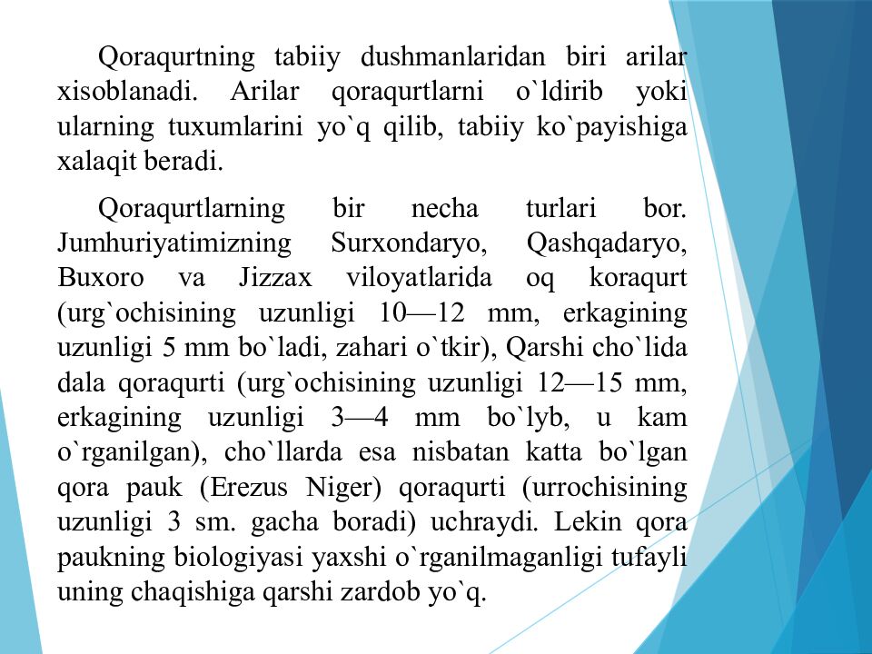 Qoraqurtning tabiiy dushmanlaridan biri arilar xisoblanadi. Arilar qoraqurtlarni o`ldirib yoki ularning tuxumlarini yo`q qilib, tabiiy ko`payishiga xalaqit beradi. Qoraqurtlarning bir necha turlari bor. Jumhuriyatimizning Surxondaryo, Qashqadaryo, Buxoro va Jizzax viloyatlarida oq koraqurt ( urg`ochisining uzunligi 10—12 mm, erkagining uzunligi 5 mm bo`ladi, zahari o`tkir ), Qarshi cho`lida dala qoraqurti ( urg`ochisining uzunligi 12—15 mm, erkagining uzunligi 3—4 mm bo`lyb, u kam o`rganilgan ), cho`llarda esa nisbatan katta bo`lgan qora pauk ( Erezus Niger) qoraqurti ( urrochisining uzunligi 3 sm. gacha boradi ) uchraydi. Lekin qora paukning biologiyasi yaxshi o`rganilmaganligi tufayli uning chaqishiga qarshi zardob yo`q.