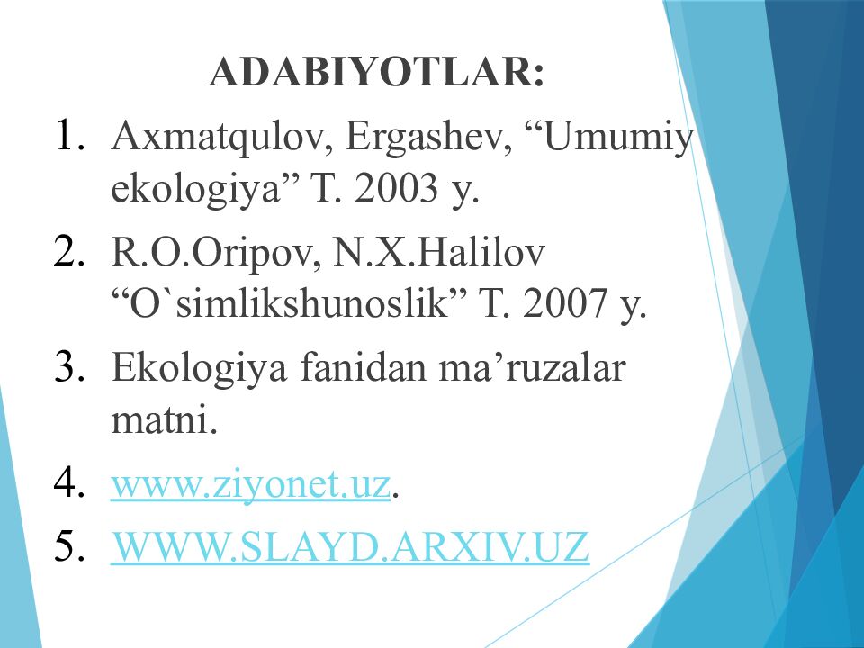 ADABIYOTLAR: Axmatqulov, Ergashev, “ Umumiy ekologiya ” T. 2003 y. R.O.Oripov, N.X.Halilov “O`simlikshunoslik” T. 2007 y. Ekologiya fanidan ma’ruzalar matni. www.ziyonet.uz. WWW.SLAYD.ARXIV.UZ