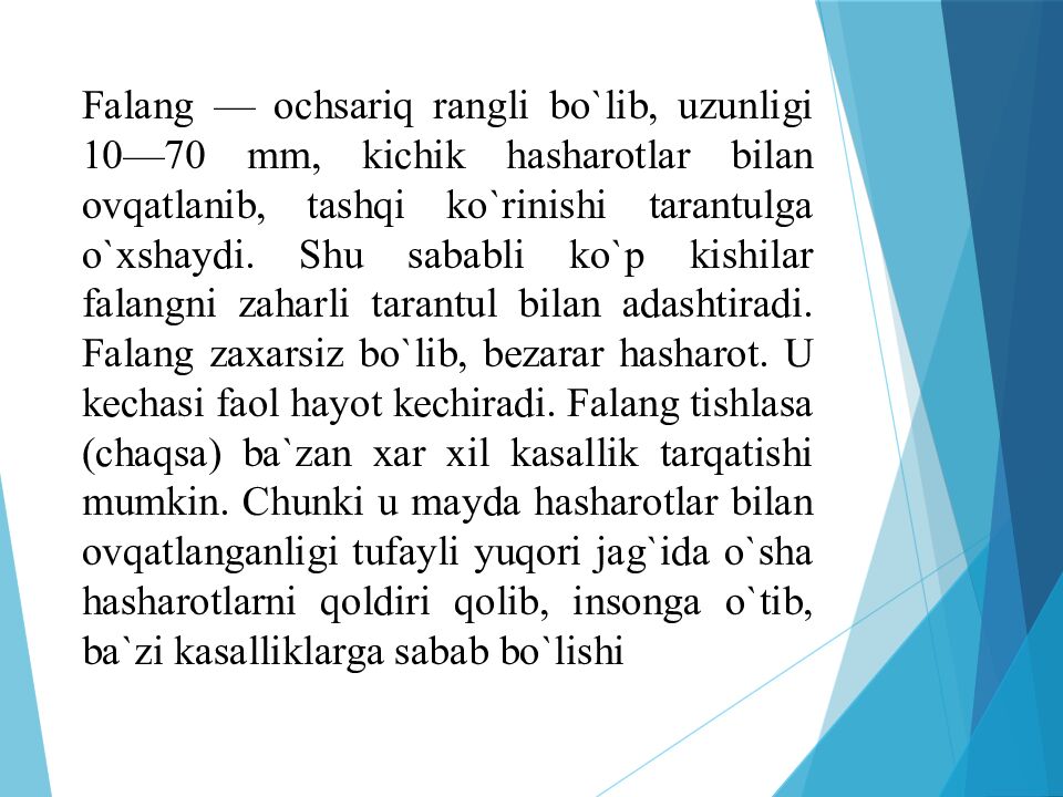 Falang — ochsariq rangli bo`lib, uzunligi 10—70 mm, kichik hasharotlar bilan ovqatlanib, tashqi ko`rinishi tarantulga o`xshaydi. Shu sababli ko`p kishilar falangni zaharli tarantul bilan adashtiradi. Falang zaxarsiz bo`lib, bezarar hasharot. U kechasi faol hayot kechiradi. Falang tishlasa ( chaqsa ) ba`zan xar xil kasallik tarqatishi mumkin. Chunki u mayda hasharotlar bilan ovqatlanganligi tufayli yuqori jag`ida o`sha hasharotlarni qoldiri qolib, insonga o`tib, ba`zi kasalliklarga sabab bo`lishi