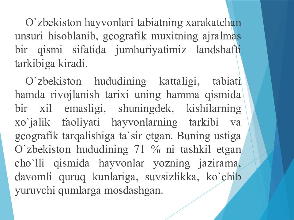 O`zbekiston hayvonlari tabiatning xarakatchan unsuri hisoblanib, geografik muxitning ajralmas bir qismi sifatida jumhuriyatimiz landshafti tarkibiga kiradi. O`zbekiston hududining kattaligi, tabiati hamda rivojlanish tarixi uning hamma qismida bir xil emasligi, shuningdek, kishilarning xo`jalik faoliyati hayvonlarning tarkibi va geografik tarqalishiga ta`sir etgan. Buning ustiga O`zbekiston hududining 71 % ni tashkil etgan cho`lli qismida hayvonlar yozning jazirama, davomli quruq kunlariga, suvsizlikka, ko`chib yuruvchi qumlarga mosdashgan.