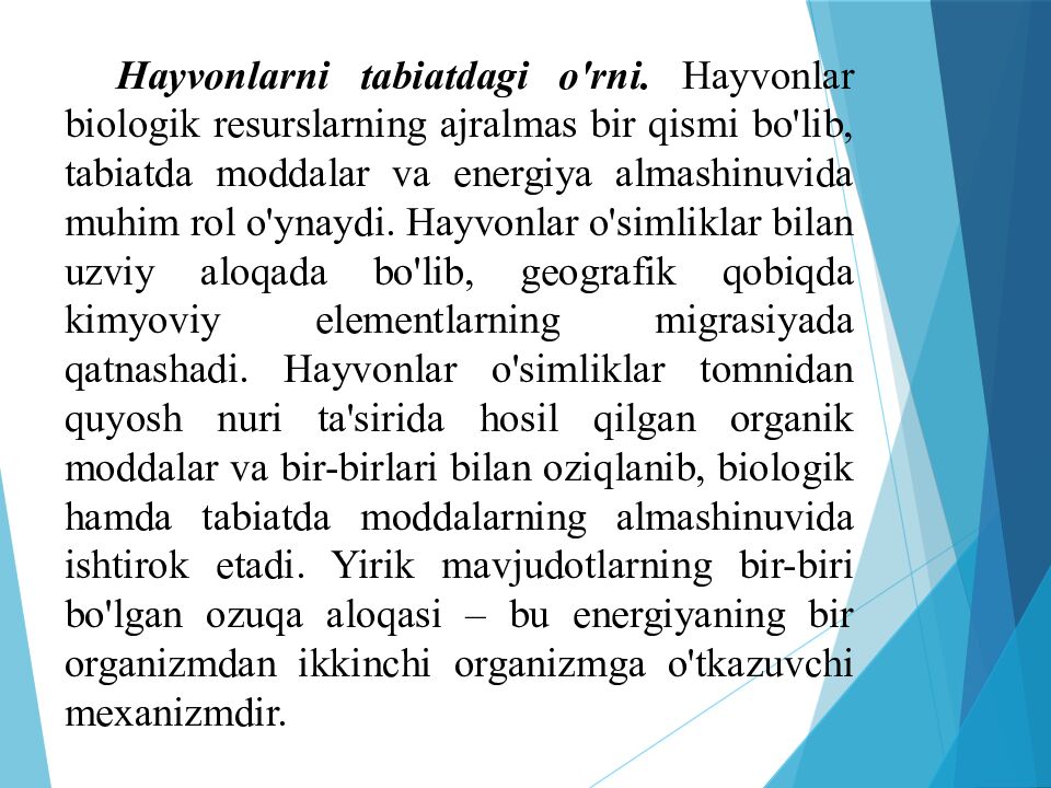 Hayvonlarni tabiatdagi o'rni. Hayvonlar biologik resurslarning ajralmas bir qismi bo'lib, tabiatda moddalar va energiya almashinuvida muhim rol o'ynaydi. Hayvonlar o'simliklar bilan uzviy aloqada bo'lib, geografik qobiqda kimyoviy elementlarning migrasiyada qatnashadi. Hayvonlar o'simliklar tomnidan quyosh nuri ta'sirida hosil qilgan organik moddalar va bir-birlari bilan oziqlanib, biologik hamda tabiatda moddalarning almashinuvida ishtirok etadi. Yirik mavjudotlarning bir-biri bo'lgan ozuqa aloqasi – bu energiyaning bir organizmdan ikkinchi organizmga o'tkazuvchi mexanizmdir.