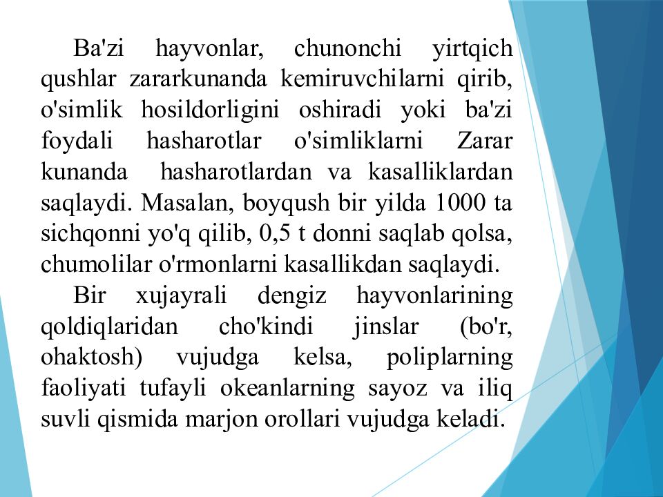Ba'zi hayvonlar, chunonchi yirtqich qushlar zararkunanda kemiruvchilarni qirib, o'simlik hosildorligini oshiradi yoki ba'zi foydali hasharotlar o'simliklarni Zarar kunanda hasharotlardan va kasalliklardan saqlaydi. Masalan, boyqush bir yilda 1000 ta sichqonni yo'q qilib, 0,5 t donni saqlab qolsa, chumolilar o'rmonlarni kasallikdan saqlaydi. Bir xujayrali dengiz hayvonlarining qoldiqlaridan cho'kindi jinslar ( bo'r, ohaktosh ) vujudga kelsa, poliplarning faoliyati tufayli okeanlarning sayoz va iliq suvli qismida marjon orollari vujudga keladi.