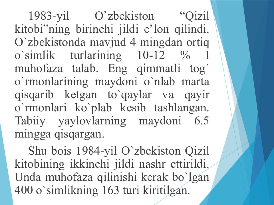 1983-yil O`zbekiston “ Qizil kitobi”ning birinchi jildi e’lon qilindi. O`zbekistonda mavjud 4 mingdan ortiq o`simlik turlarining 10-12 % I muhofaza talab. Eng qimmatli tog` o`rmonlarining maydoni o`nlab marta qisqarib ketgan to`qaylar va qayir o`rmonlari ko`plab kesib tashlangan. Tabiiy yaylovlarning maydoni 6.5 mingga qisqargan. Shu bois 1984-yil O`zbekiston Qizil kitobining ikkinchi jildi nashr ettirildi. Unda muhofaza qilinishi kerak bo`lgan 400 o`simlikning 163 turi kiritilgan.