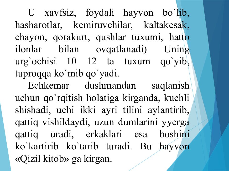 U xavfsiz, foydali hayvon bo`lib, hasharotlar, kemiruvchilar, kaltakesak, chayon, qorakurt, qushlar tuxumi, hatto ilonlar bilan ovqatlanadi ) Uning urg`ochisi 10—12 ta tuxum qo`yib, tuproqqa ko`mib qo`yadi. Echkemar dushmandan saqlanish uchun qo`rqitish holatiga kirganda, kuchli shishadi, uchi ikki ayri tilini aylantirib, qattiq vishildaydi, uzun dumlarini yyerga qattiq uradi, erkaklari esa boshini ko`kartirib ko`tarib turadi. Bu hayvon « Qizil kitob » ga kirgan.