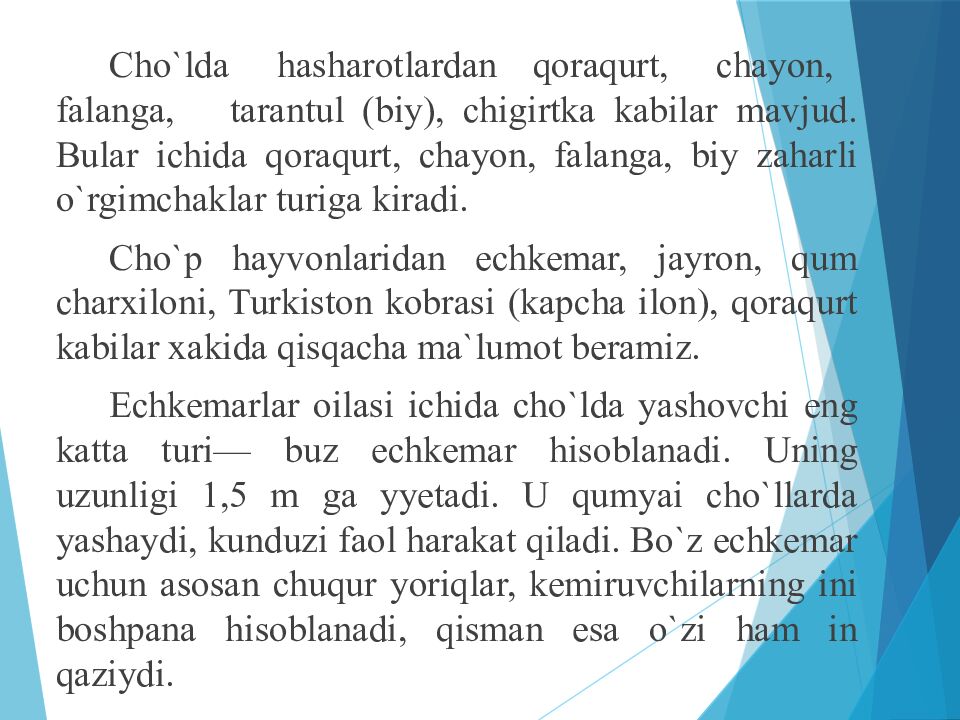 Cho`lda hasharotlardan qoraqurt, chayon, falanga, tarantul ( biy ), chigirtka kabilar mavjud. Bular ichida qoraqurt, chayon, falanga, biy zaharli o`rgimchaklar turiga kiradi. Cho`p hayvonlaridan echkemar, jayron, qum charxiloni, Turkiston kobrasi ( kapcha ilon ), qoraqurt kabilar xakida qisqacha ma`lumot beramiz. Echkemarlar oilasi ichida cho`lda yashovchi eng katta turi — buz echkemar hisoblanadi. Uning uzunligi 1,5 m ga yyetadi. U qumyai cho`llarda yashaydi, kunduzi faol harakat qiladi. Bo`z echkemar uchun asosan chuqur yoriqlar, kemiruvchilarning ini boshpana hisoblanadi, qisman esa o`zi ham in qaziydi.