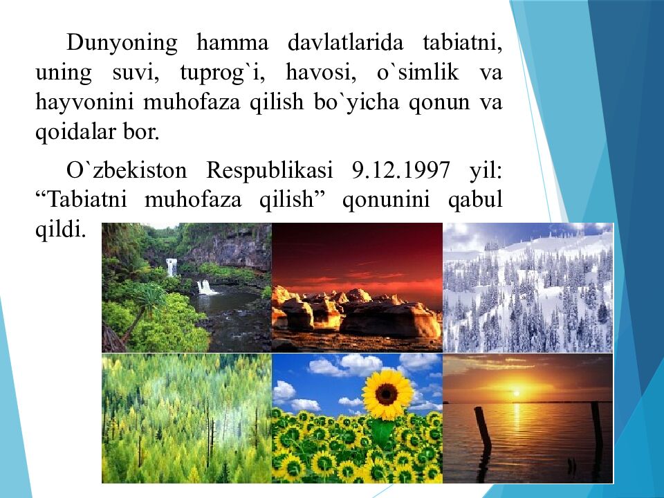 Dunyoning hamma davlatlarida tabiatni, uning suvi, tuprog`i, havosi, o`simlik va hayvonini muhofaza qilish bo`yicha qonun va qoidalar bor. O`zbekiston Respublikasi 9.12.1997 yil : “ Tabiatni muhofaza qilish ” qonunini qabul qildi.