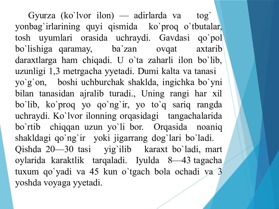 Gyurza ( ko`lvor ilon ) — adirlarda va tog` yonbag`irlarining quyi qismida ko`proq o`tbutalar, tosh uyumlari orasida uchraydi. Gavdasi qo`pol bo`lishiga qaramay, ba`zan ovqat axtarib daraxtlarga ham chiqadi. U o`ta zaharli ilon bo`lib, uzunligi 1,3 metrgacha yyetadi. Dumi kalta va tanasi yo`g`on, boshi uchburchak shaklda, ingichka bo`yni bilan tanasidan ajralib turadi., Uning rangi har xil bo`lib, ko`proq yo qo`ng`ir, yo to`q sariq rangda uchraydi. Ko`lvor ilonning orqasidagi tangachalarida bo`rtib chiqqan uzun yo`li bor. Orqasida noaniq shakldagi qo`ng`ir yoki jigarrang dog`lari bo`ladi. Qishda 20—30 tasi yig`ilib karaxt bo`ladi, mart oylarida karaktlik tarqaladi. Iyulda 8—43 tagacha tuxum qo`yadi va 45 kun o`tgach bola ochadi va 3 yoshda voyaga yyetadi.