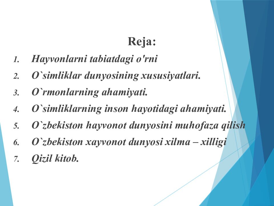 Reja: Hayvonlarni tabiatdagi o'rni O`simliklar dunyosining xususiyatlari. O`rmonlarning ahamiyati. O`simliklarning inson hayotidagi ahamiyati. O ` zbekiston hayvonot dunyosini muhofaza qilish O`zbekiston xayvonot dunyosi xilma – xilligi Qizil kitob.