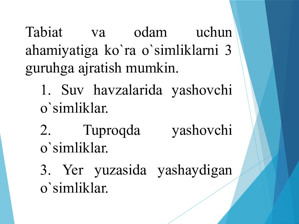 Tabiat va odam uchun ahamiyatiga ko`ra o`simliklarni 3 guruhga ajratish mumkin. 1. Suv havzalarida yashovchi o`simliklar. 2. Tuproqda yashovchi o`simliklar. 3. Yer yuzasida yashaydigan o`simliklar.