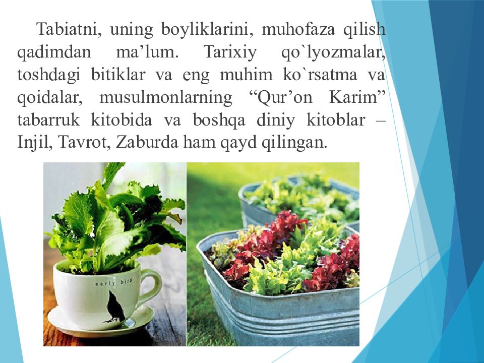 Tabiatni, uning boyliklarini, muhofaza qilish qadimdan ma’lum. Tarixiy qo`lyozmalar, toshdagi bitiklar va eng muhim ko`rsatma va qoidalar, musulmonlarning “ Qur’on Karim” tabarruk kitobida va boshqa diniy kitoblar – Injil, Tavrot, Zaburda ham qayd qilingan.