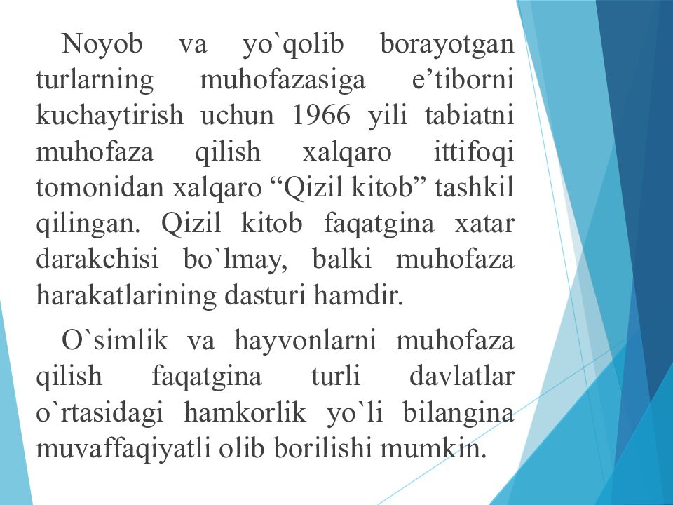 Noyob va yo`qolib borayotgan turlarning muhofazasiga e’tiborni kuchaytirish uchun 1966 yili tabiatni muhofaza qilish xalqaro ittifoqi tomonidan xalqaro “ Qizil kitob ” tashkil qilingan. Qizil kitob faqatgina xatar darakchisi bo`lmay, balki muhofaza harakatlarining dasturi hamdir. O`simlik va hayvonlarni muhofaza qilish faqatgina turli davlatlar o`rtasidagi hamkorlik yo`li bilangina muvaffaqiyatli olib borilishi mumkin.