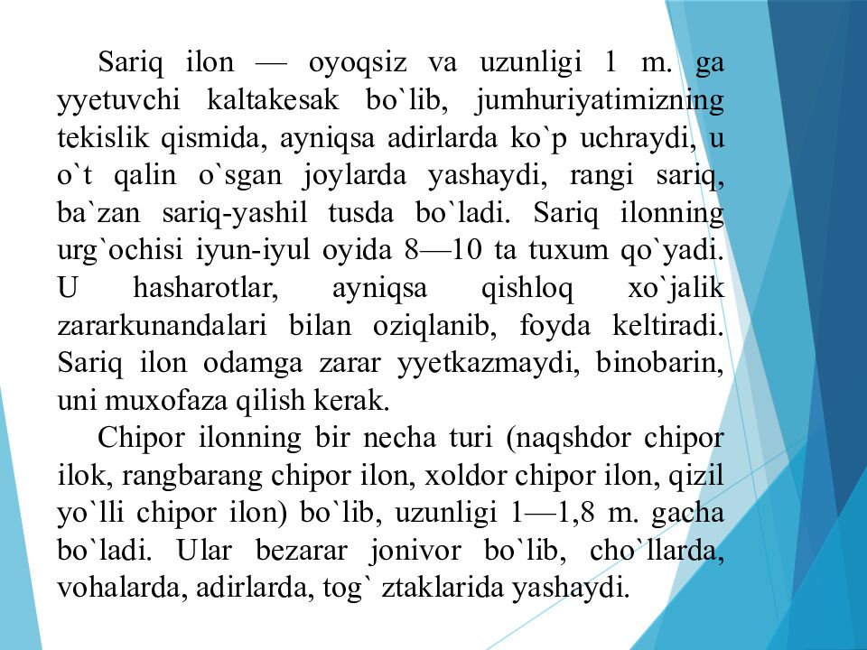 Sariq ilon — oyoqsiz va uzunligi 1 m. ga yyetuvchi kaltakesak bo`lib, jumhuriyatimizning tekislik qismida, ayniqsa adirlarda ko`p uchraydi, u o`t qalin o`sgan joylarda yashaydi, rangi sariq, ba`zan sariq-yashil tusda bo`ladi. Sariq ilonning urg`ochisi iyun-iyul oyida 8—10 ta tuxum qo`yadi. U hasharotlar, ayniqsa qishloq xo`jalik zararkunandalari bilan oziqlanib, foyda keltiradi. Sariq ilon odamga zarar yyetkazmaydi, binobarin, uni muxofaza qilish kerak. Chipor ilonning bir necha turi ( naqshdor chipor ilok, rangbarang chipor ilon, xoldor chipor ilon, qizil yo`lli chipor ilon ) bo`lib, uzunligi 1—1,8 m. gacha bo`ladi. Ular bezarar jonivor bo`lib, cho`llarda, vohalarda, adirlarda, tog` ztaklarida yashaydi.