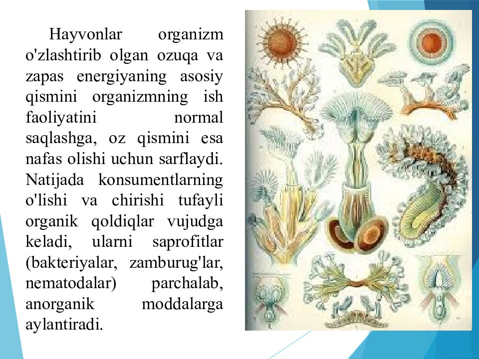 Hayvonlar organizm o'zlashtirib olgan ozuqa va zapas energiyaning asosiy qismini organizmning ish faoliyatini normal saqlashga, oz qismini esa nafas olishi uchun sarflaydi. Natijada konsumentlarning o'lishi va chirishi tufayli organik qoldiqlar vujudga keladi, ularni saprofitlar ( bakteriyalar, zamburug'lar, nematodalar ) parchalab, anorganik moddalarga aylantiradi.