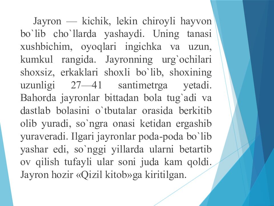 Jayron — kichik, lekin chiroyli hayvon bo`lib cho`llarda yashaydi. Uning tanasi xushbichim, oyoqlari ingichka va uzun, kumkul rangida. Jayronning urg`ochilari shoxsiz, erkaklari shoxli bo`lib, shoxining uzunligi 27—41 santimetrga yetadi. Bahorda jayronlar bittadan bola tug`adi va dastlab bolasini o`tbutalar orasida berkitib olib yuradi, so`ngra onasi ketidan ergashib yuraveradi. Ilgari jayronlar poda-poda bo`lib yashar edi, so`nggi yillarda ularni betartib ov qilish tufayli ular soni juda kam qoldi. Jayron hozir « Qizil kitob»ga kiritilgan.