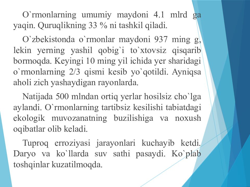 O`rmonlarning umumiy maydoni 4.1 mlrd ga yaqin. Quruqlikning 33 % ni tashkil qiladi. O`zbekistonda o`rmonlar maydoni 937 ming g, lekin yerning yashil qobig`i to`xtovsiz qisqarib bormoqda. Keyingi 10 ming yil ichida yer sharidagi o`rmonlarning 2/3 qismi kesib yo`qotildi. Ayniqsa aholi zich yashaydigan rayonlarda. Natijada 500 mlndan ortiq yerlar hosilsiz cho`lga aylandi. O`rmonlarning tartibsiz kesilishi tabiatdagi ekologik muvozanatning buzilishiga va noxush oqibatlar olib keladi. Tuproq erroziyasi jarayonlari kuchayib ketdi. Daryo va ko`llarda suv sathi pasaydi. Ko`plab toshqinlar kuzatilmoqda.