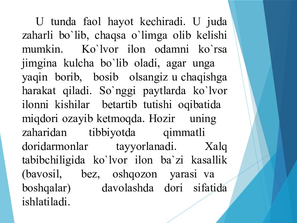 U tunda faol hayot kechiradi. U juda zaharli bo`lib, chaqsa o`limga olib kelishi mumkin. Ko`lvor ilon odamni ko`rsa jimgina kulcha bo`lib oladi, agar unga yaqin borib, bosib olsangiz u chaqishga harakat qiladi. So`nggi paytlarda ko`lvor ilonni kishilar betartib tutishi oqibatida miqdori ozayib ketmoqda. Hozir uning zaharidan tibbiyotda qimmatli doridarmonlar tayyorlanadi. Xalq tabibchiligida ko`lvor ilon ba`zi kasallik ( bavosil, bez, oshqozon yarasi va boshqalar ) davolashda dori sifatida ishlatiladi.