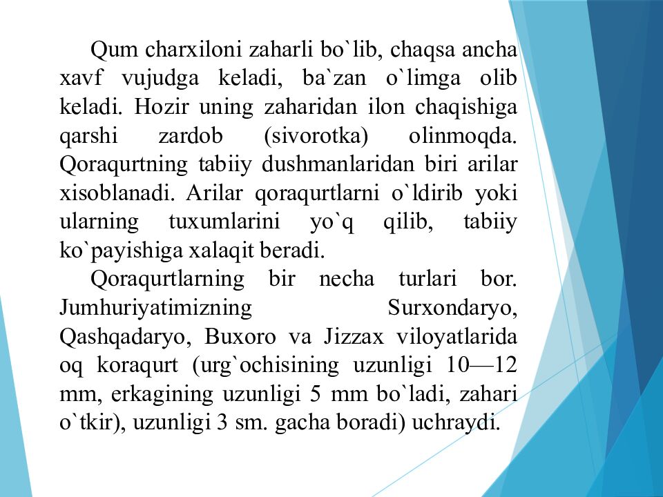 Qum charxiloni zaharli bo`lib, chaqsa ancha xavf vujudga keladi, ba`zan o`limga olib keladi. Hozir uning zaharidan ilon chaqishiga qarshi zardob ( sivorotka ) olinmoqda. Qoraqurtning tabiiy dushmanlaridan biri arilar xisoblanadi. Arilar qoraqurtlarni o`ldirib yoki ularning tuxumlarini yo`q qilib, tabiiy ko`payishiga xalaqit beradi. Qoraqurtlarning bir necha turlari bor. Jumhuriyatimizning Surxondaryo, Qashqadaryo, Buxoro va Jizzax viloyatlarida oq koraqurt ( urg`ochisining uzunligi 10—12 mm, erkagining uzunligi 5 mm bo`ladi, zahari o`tkir ), uzunligi 3 sm. gacha boradi ) uchraydi.