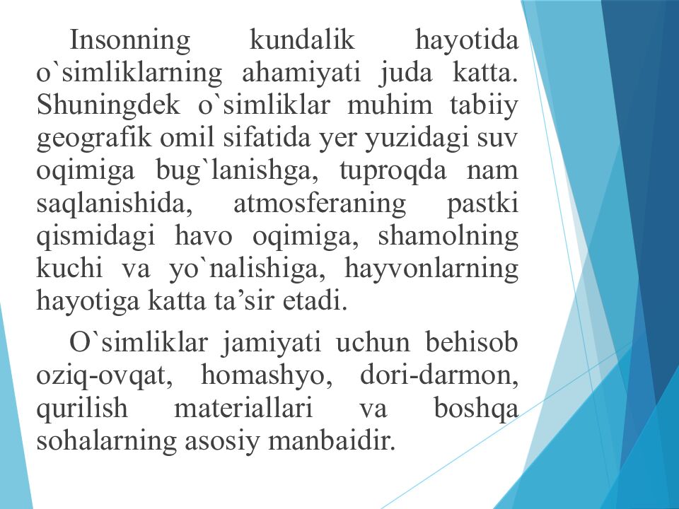 Insonning kundalik hayotida o`simliklarning ahamiyati juda katta. Shuningdek o`simliklar muhim tabiiy geografik omil sifatida yer yuzidagi suv oqimiga bug`lanishga, tuproqda nam saqlanishida, atmosferaning pastki qismidagi havo oqimiga, shamolning kuchi va yo`nalishiga, hayvonlarning hayotiga katta ta’sir etadi. O`simliklar jamiyati uchun behisob oziq-ovqat, homashyo, dori-darmon, qurilish materiallari va boshqa sohalarning asosiy manbaidir.