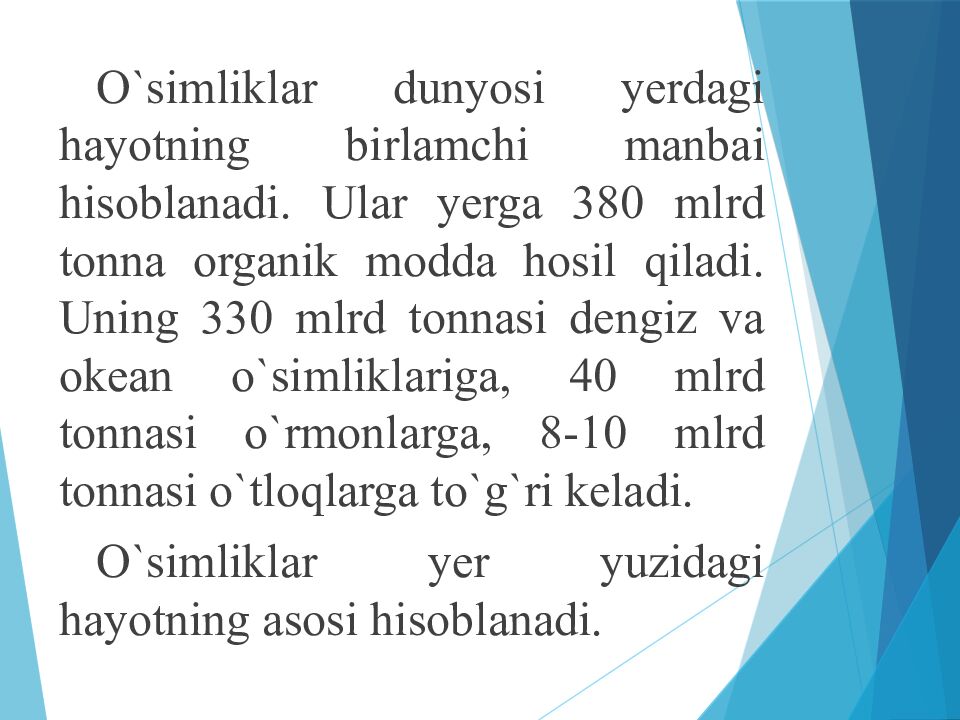O`simliklar dunyosi yerdagi hayotning birlamchi manbai hisoblanadi. Ular yerga 380 mlrd tonna organik modda hosil qiladi. Uning 330 mlrd tonnasi dengiz va okean o`simliklariga, 40 mlrd tonnasi o`rmonlarga, 8-10 mlrd tonnasi o`tloqlarga to`g`ri keladi. O`simliklar yer yuzidagi hayotning asosi hisoblanadi.
