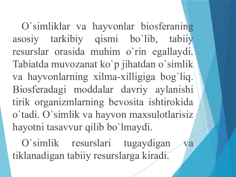 O`simliklar va hayvonlar biosferaning asosiy tarkibiy qismi bo`lib, tabiiy resurslar orasida muhim o`rin egallaydi. Tabiatda muvozanat ko`p jihatdan o`simlik va hayvonlarning xilma-xilligiga bog`liq. Biosferadagi moddalar davriy aylanishi tirik organizmlarning bevosita ishtirokida o`tadi. O`simlik va hayvon maxsulotlarisiz hayotni tasavvur qilib bo`lmaydi. O`simlik resurslari tugaydigan va tiklanadigan tabiiy resurslarga kiradi.