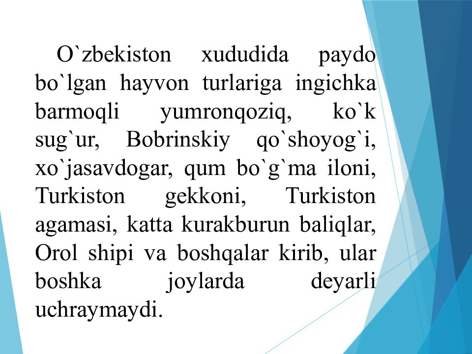 O`zbekiston xududida paydo bo`lgan hayvon turlariga ingichka barmoqli yumronqoziq, ko`k sug`ur, Bobrinskiy qo`shoyog`i, xo`jasavdogar, qum bo`g`ma iloni, Turkiston gekkoni, Turkiston agamasi, katta kurakburun baliqlar, Orol shipi va boshqalar kirib, ular boshka joylarda deyarli uchraymaydi.