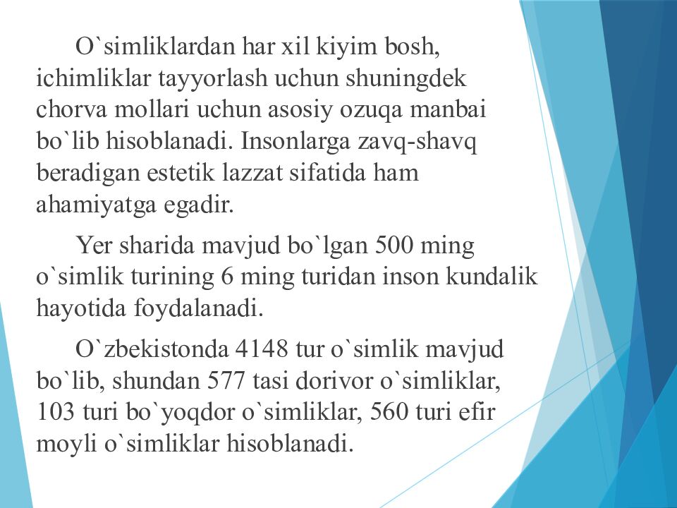 O`simliklardan har xil kiyim bosh, ichimliklar tayyorlash uchun shuningdek chorva mollari uchun asosiy ozuqa manbai bo`lib hisoblanadi. Insonlarga zavq-shavq beradigan estetik lazzat sifatida ham ahamiyatga egadir. Yer sharida mavjud bo`lgan 500 ming o`simlik turining 6 ming turidan inson kundalik hayotida foydalanadi. O`zbekistonda 4148 tur o`simlik mavjud bo`lib, shundan 577 tasi dorivor o`simliklar, 103 turi bo`yoqdor o`simliklar, 560 turi efir moyli o`simliklar hisoblanadi.