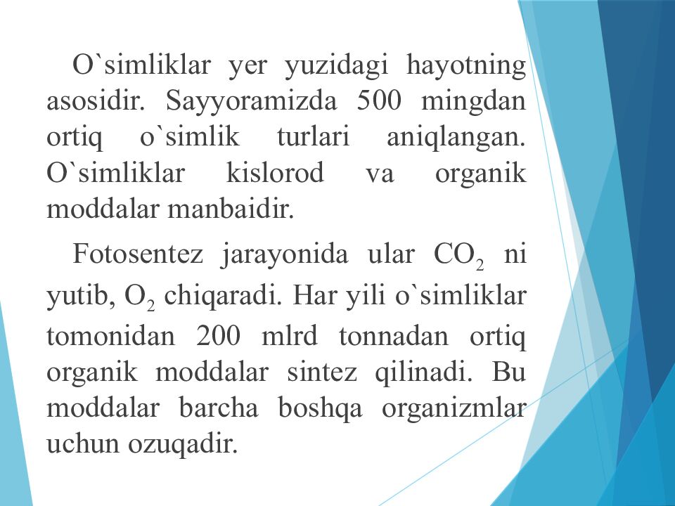 O`simliklar yer yuzidagi hayotning asosidir. Sayyoramizda 500 mingdan ortiq o`simlik turlari aniqlangan. O`simliklar kislorod va organik moddalar manbaidir. Fotosentez jarayonida ular CO 2 ni yutib, O 2 chiqaradi. Har yili o`simliklar tomonidan 200 mlrd tonnadan ortiq organik moddalar sintez qilinadi. Bu moddalar barcha boshqa organizmlar uchun ozuqadir.