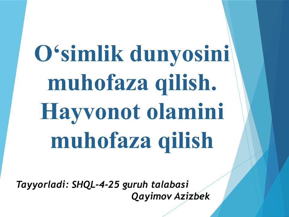 O‘simlik dunyosini muhofaza qilish. H ayvonot olamini muhofaza qilish Tayyorladi: SHQL-4-25 guruh talabasi Qayimov Azizbek