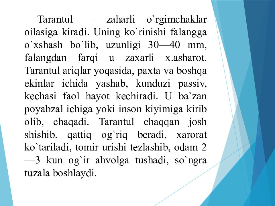 Tarantul — zaharli o`rgimchaklar oilasiga kiradi. Uning ko`rinishi falangga o`xshash bo`lib, uzunligi 30—40 mm, falangdan farqi u zaxarli x.asharot. Tarantul ariqlar yoqasida, paxta va boshqa ekinlar ichida yashab, kunduzi passiv, kechasi faol hayot kechiradi. U ba`zan poyabzal ichiga yoki inson kiyimiga kirib olib, chaqadi. Tarantul chaqqan josh shishib. qattiq og`riq beradi, xarorat ko`tariladi, tomir urishi tezlashib, odam 2—3 kun og`ir ahvolga tushadi, so`ngra tuzala boshlaydi.