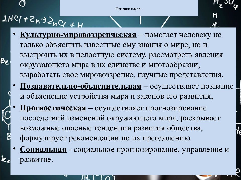 Культурно-мировоззренческая – помогает человеку не только объяснить известные ему знания о мире, но и выстроить их в целостную систему, рассмотреть явления окружающего мира в их единстве и многообразии, выработать свое мировоззрение, научные представления, П ознавательно-объяснительная – осуществляет познание и объяснение устройства мира и законов его развития, П рогностическая – осуществляет прогнозирование последствий изменений окружающего мира, раскрывает возможные опасные тенденции развития общества, формулирует рекомендации по их преодолению С оциальная - социальное прогнозирование, управление и развитие.