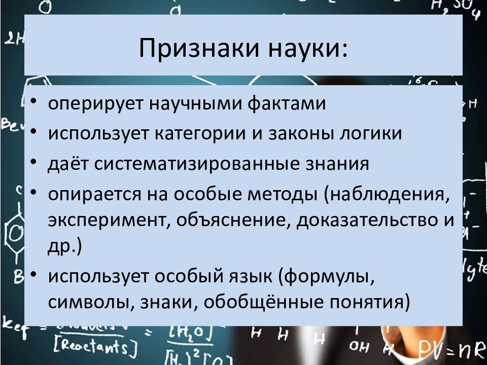 оперирует научными фактами использует категории и законы логики даёт систематизированные знания опирается на особые методы (наблюдения, эксперимент, объяснение, доказательство и др.) использует особый язык (формулы, символы, знаки, обобщённые понятия)