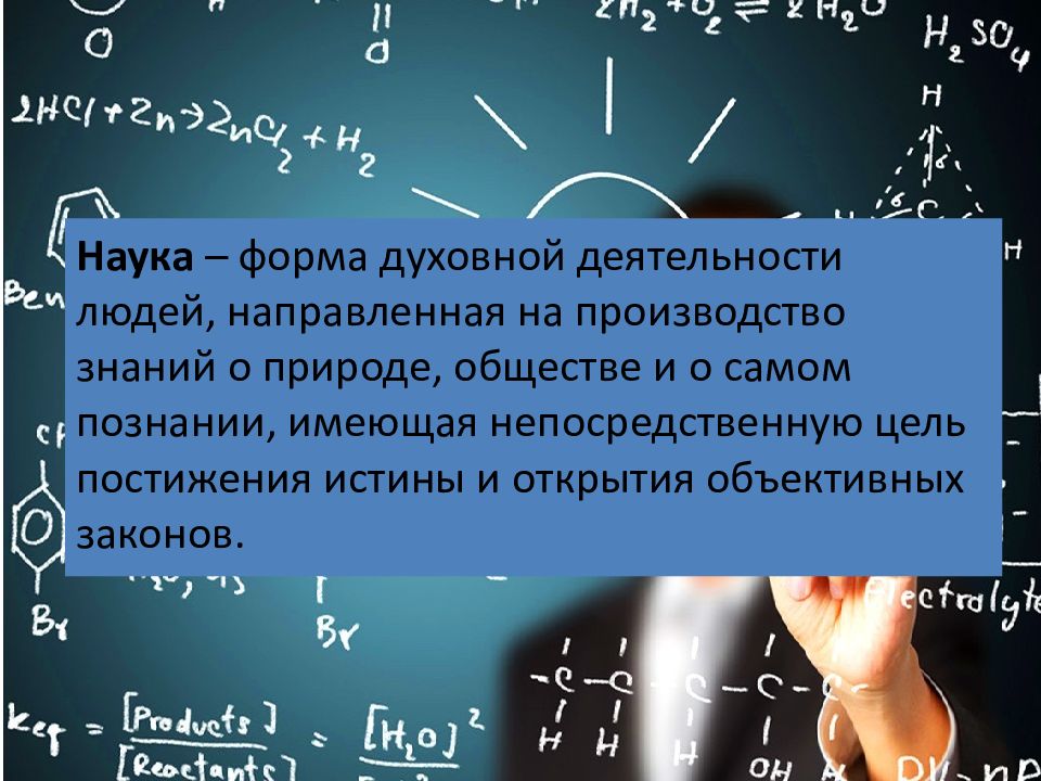 Наука – форма духовной деятельности людей, направленная на производство знаний о природе, обществе и о самом познании, имеющая непосредственную цель постижения истины и открытия объективных законов.