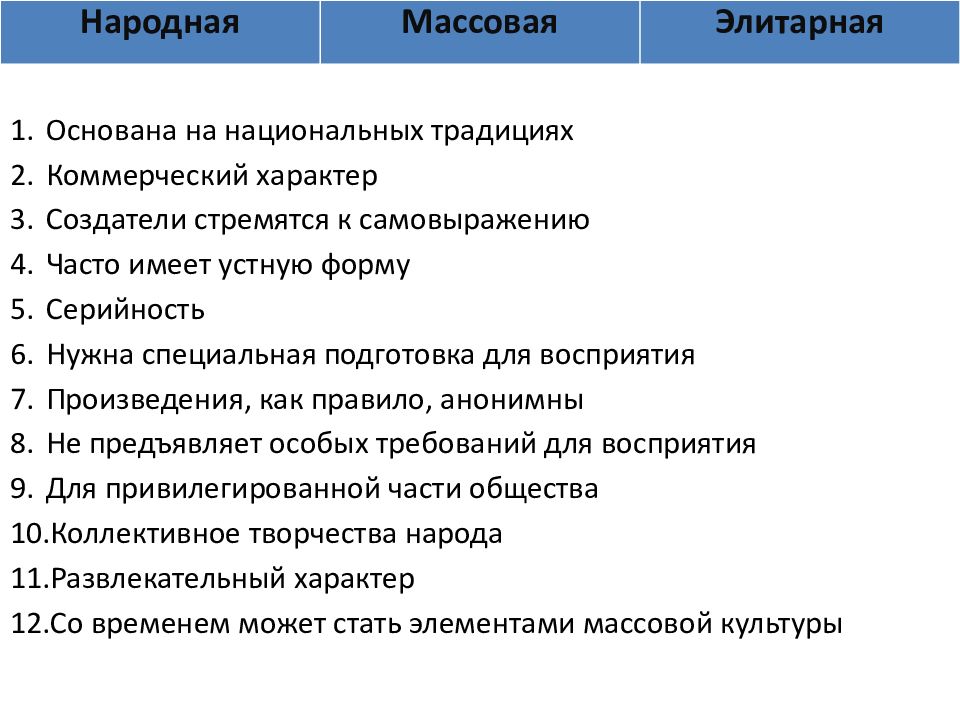 Основана на национальных традициях Коммерческий характер Создатели стремятся к самовыражению Часто имеет устную форму Серийность Нужна специальная подготовка для восприятия Произведения, как правило, анонимны Не предъявляет особых требований для восприятия Для привилегированной части общества Коллективное творчества народа Развлекательный характер Со временем может стать элементами массовой культуры Народная Массовая Элитарная