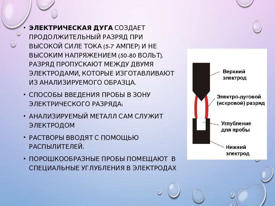 Электрическая дуга создает продолжительный разряд при высокой силе тока (5-7 Ампер) и не высоким напряжением (50-80 Вольт). Разряд пропускают между двумя электродами, которые изготавливают из анализируемого образца. Способы введения пробы в зону электрического разряда: Анализируемый металл сам служит электродом Растворы вводят с помощью распылителей. Порошкообразные пробы помещают в специальные углубления в электродах