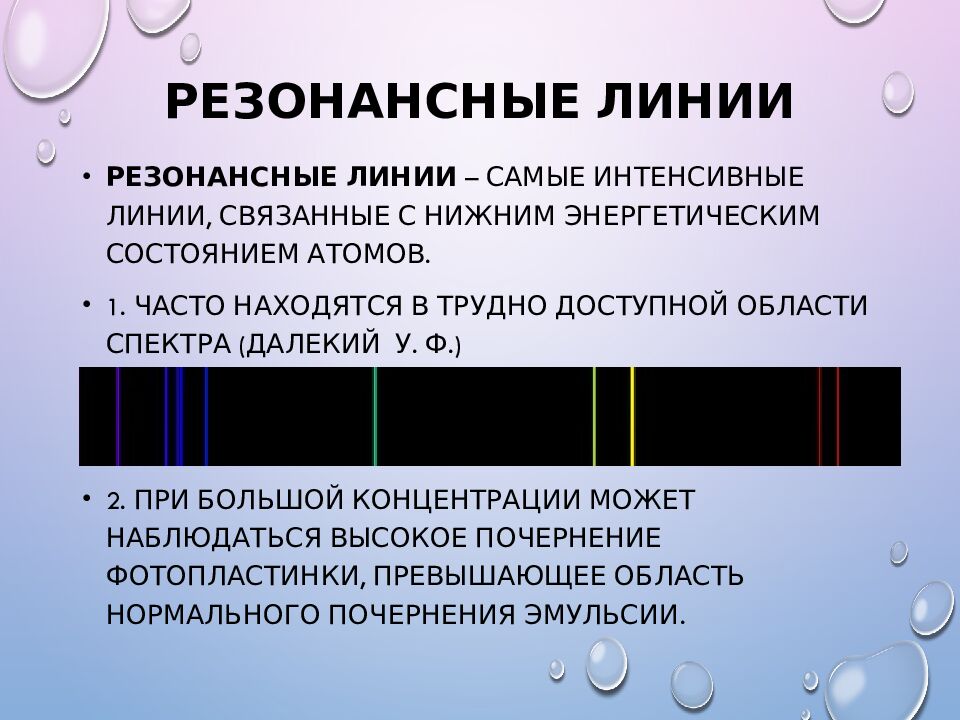 Резонансные линии – самые интенсивные линии, связанные с нижним энергетическим состоянием атомов. 1. часто находятся в трудно доступной области спектра (далекий у. ф.) 2. при большой концентрации может наблюдаться высокое почернение фотопластинки, превышающее область нормального почернения эмульсии.