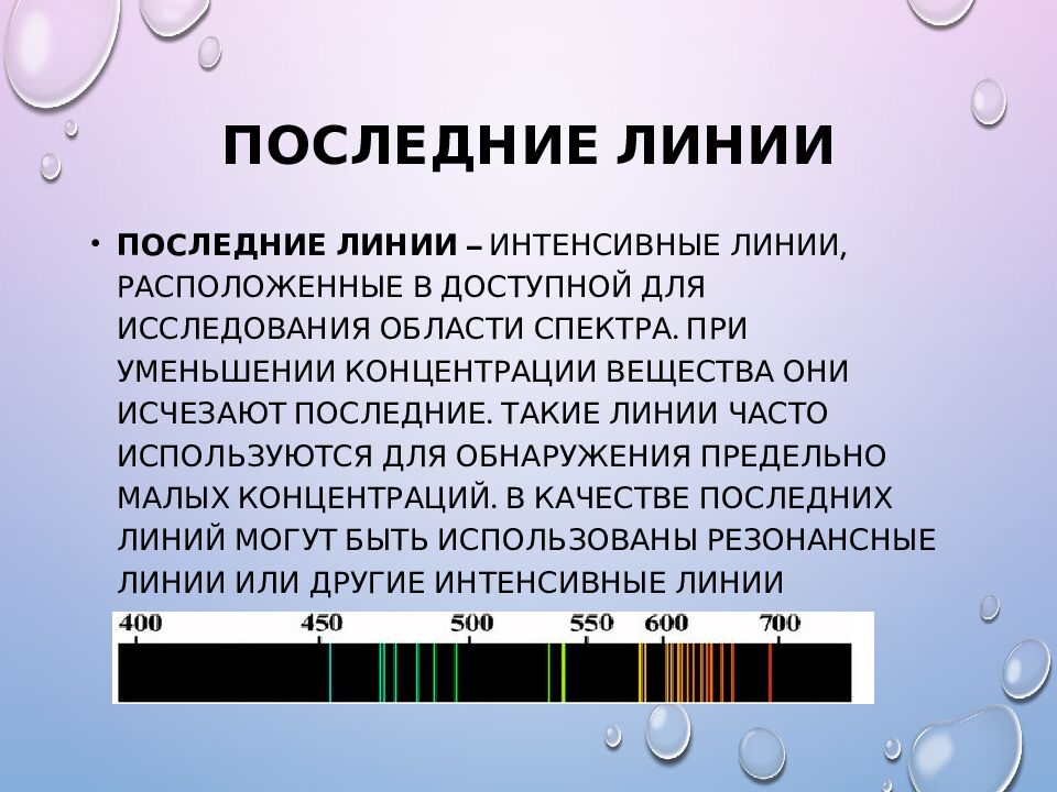 Последние линии – интенсивные линии, расположенные в доступной для исследования области спектра. При уменьшении концентрации вещества они исчезают последние. Такие линии часто используются для обнаружения предельно малых концентраций. В качестве последних линий могут быть использованы резонансные линии или другие интенсивные линии доступные для исследования.