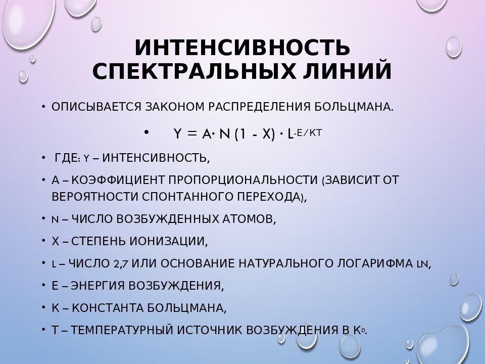 Описывается законом распределения Больцмана. Y = A· N (1 - x ) · L -Е ⁄ КТ где: Y – интенсивность, А – коэффициент пропорциональности (зависит от вероятности спонтанного перехода), N – число возбужденных атомов, х – степень ионизации, L – число 2,7 или основание натурального логарифма ln, Е – энергия возбуждения, К – константа Больцмана, Т – температурный источник возбуждения в К 0.
